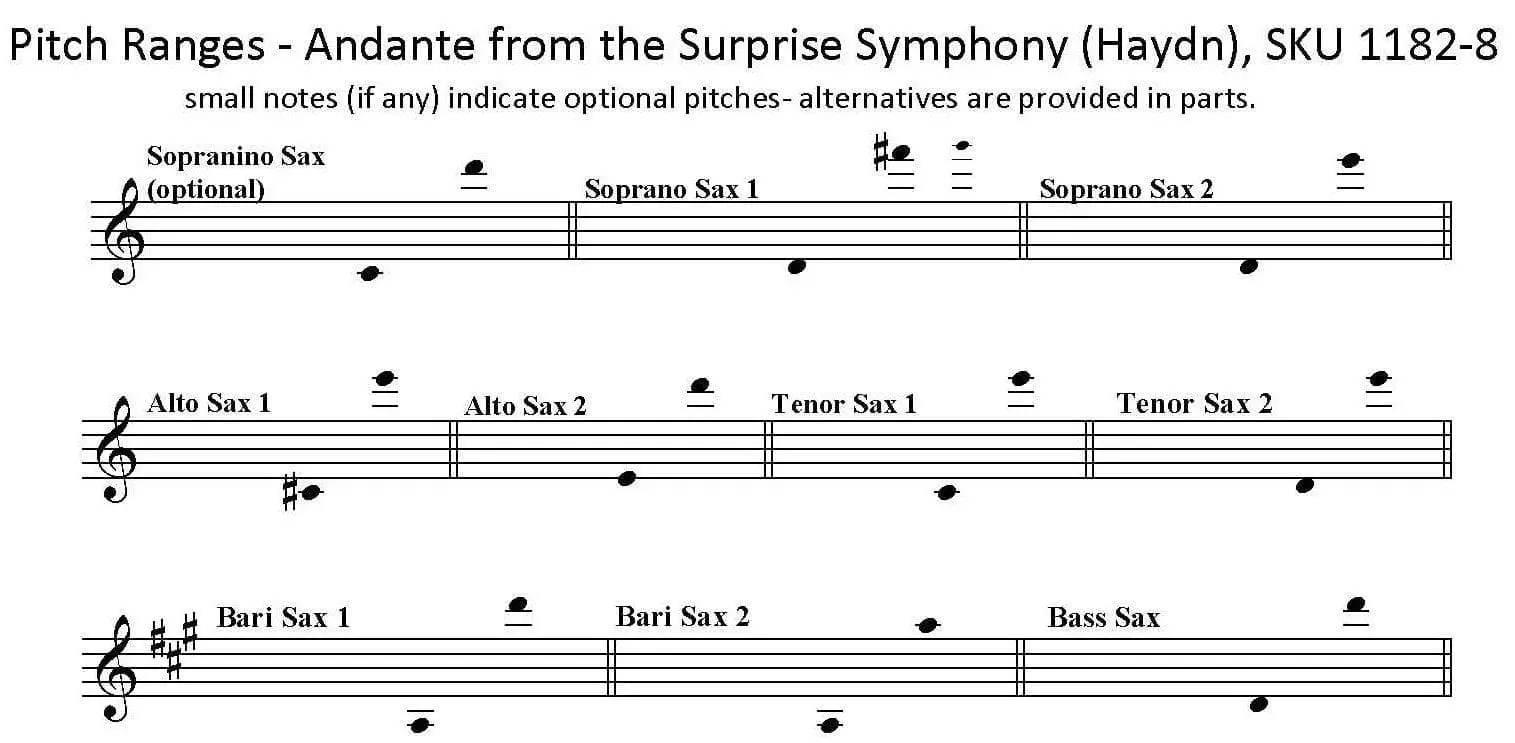 Andante from the Surprise Symphony (No. 94 in G major) by Haydn, arranged for saxophone choir (saxophone octet) with optional timpani. This transcription is in the original key and includes the following parts: