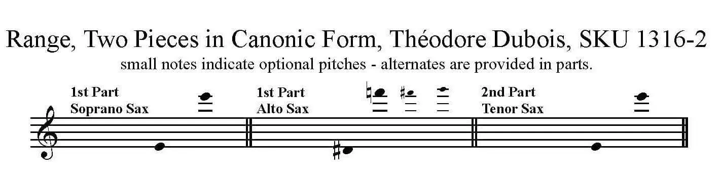 Two Pieces in Canonic Form by Théodore Dubois for Soprano and Tenor Saxophone Duet with piano. This arrangement includes a first part for soprano or alto sax and second part for tenor sax as well as the piano accompaniment.